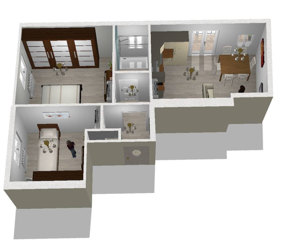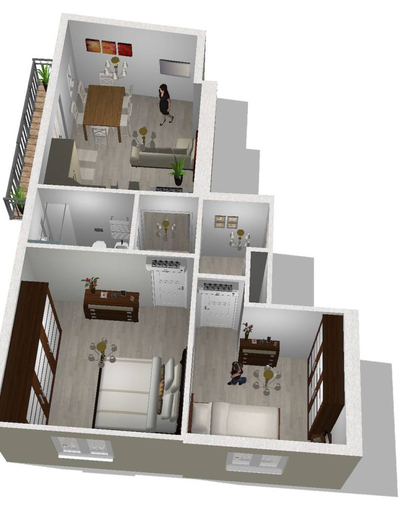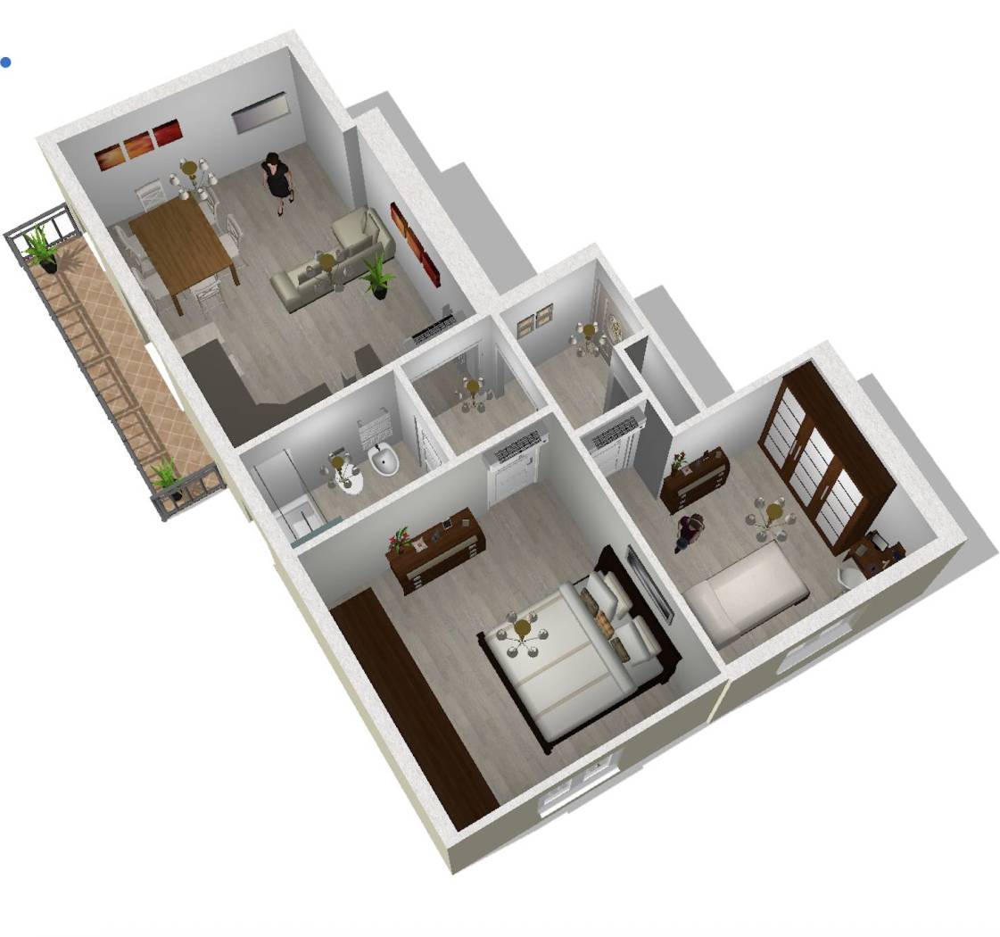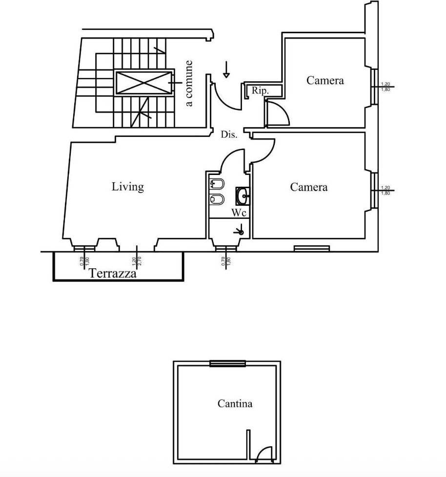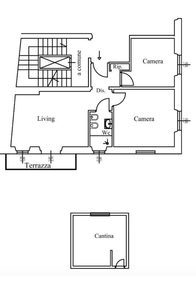 L'appartamento frutto di un frazionamento di una più ampia unità verrà così suddiviso: ingresso a comune, soggiorno con angolo cottura con accesso al balcone con affacci interni, due camere di cui una matrimoniale e una singola, servizio finestrato oltre ripostiglio.