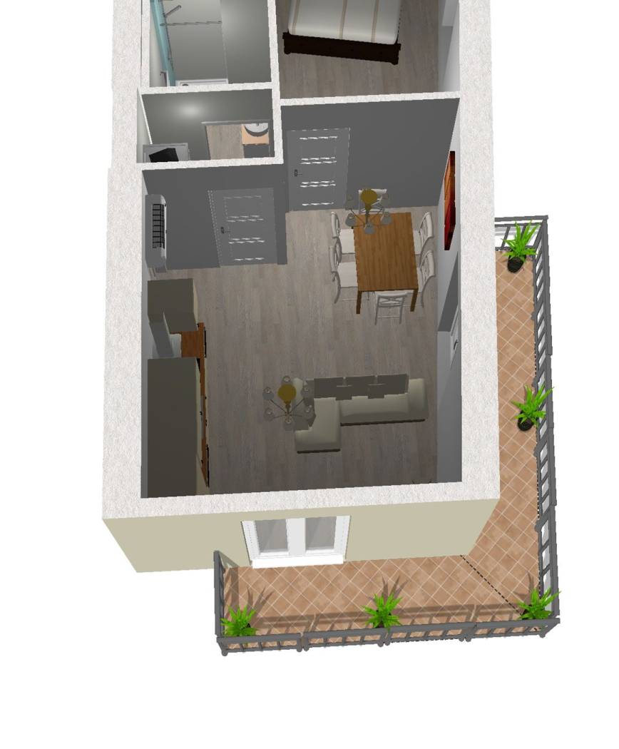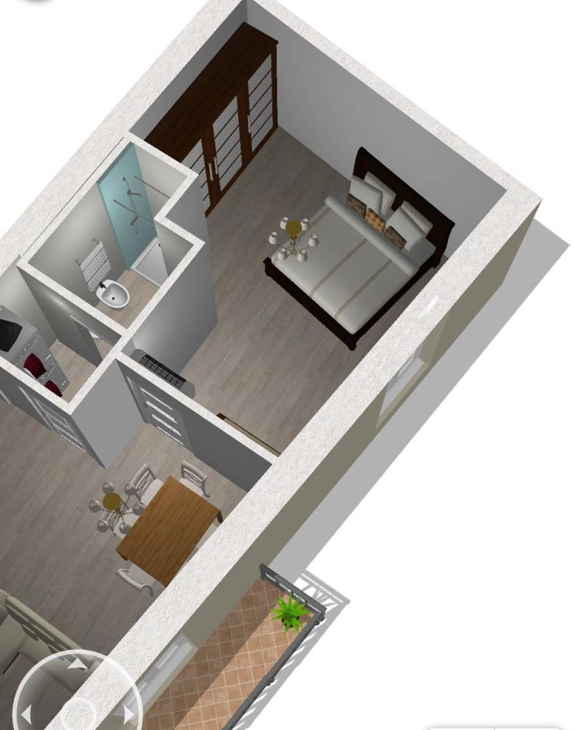 L'immobile frutto di frazionamento è così suddiviso: ingresso a comune, soggiorno con angolo cottura con accesso al balcone attraverso due porte finestre con ottimi affacci, una camera matrimoniale, servizio non finestrato con spazio lavanderia.